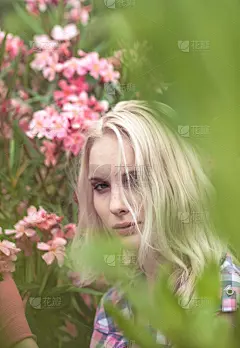 一个拿着牡丹花的女孩,一头漂亮的金发,戴着五颜六色的儿童指甲