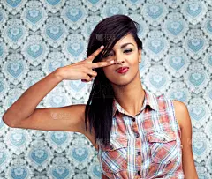 年轻美丽的时尚女孩拍摄户外附近的砖墙在家里