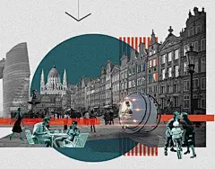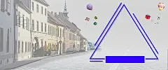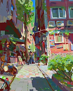这可能包含:一幅以多色方块和形状为背景的抽象画,包括一栋建筑