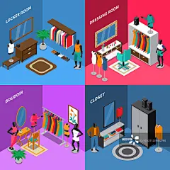 多样服饰及收纳场景插画 【酷图网】服饰,衣柜,收纳,衣架,鞋子,帽子,包包,抽屉,衣物,挂饰,行李箱,镜子,摆件,配饰,卡通,插画,矢量