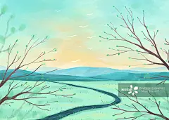 常规内容-背景系列插画风自然景观湖泊草地蓝天背景图片