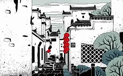 扁平风黑白江南老街古建筑徽派建筑元素插画