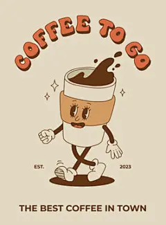 图源免费EPS |带有咖啡吉祥物的复古海报,卡通人物,有趣的彩色涂鸦风格人物,卡布奇诺,可可,拿铁,意式浓缩。矢量插图与排版元素