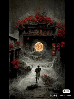 山路被金色覆盖,形成一条通往远方的道路,中间站着一个身穿红色