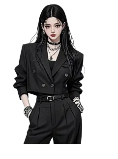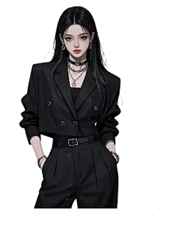这可能包含:一个头上有角的动漫人物,穿着黑色西装和金项链